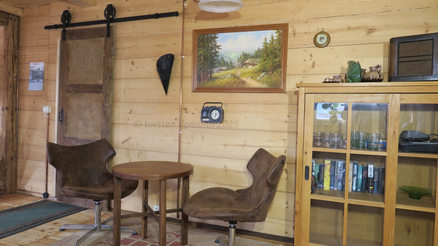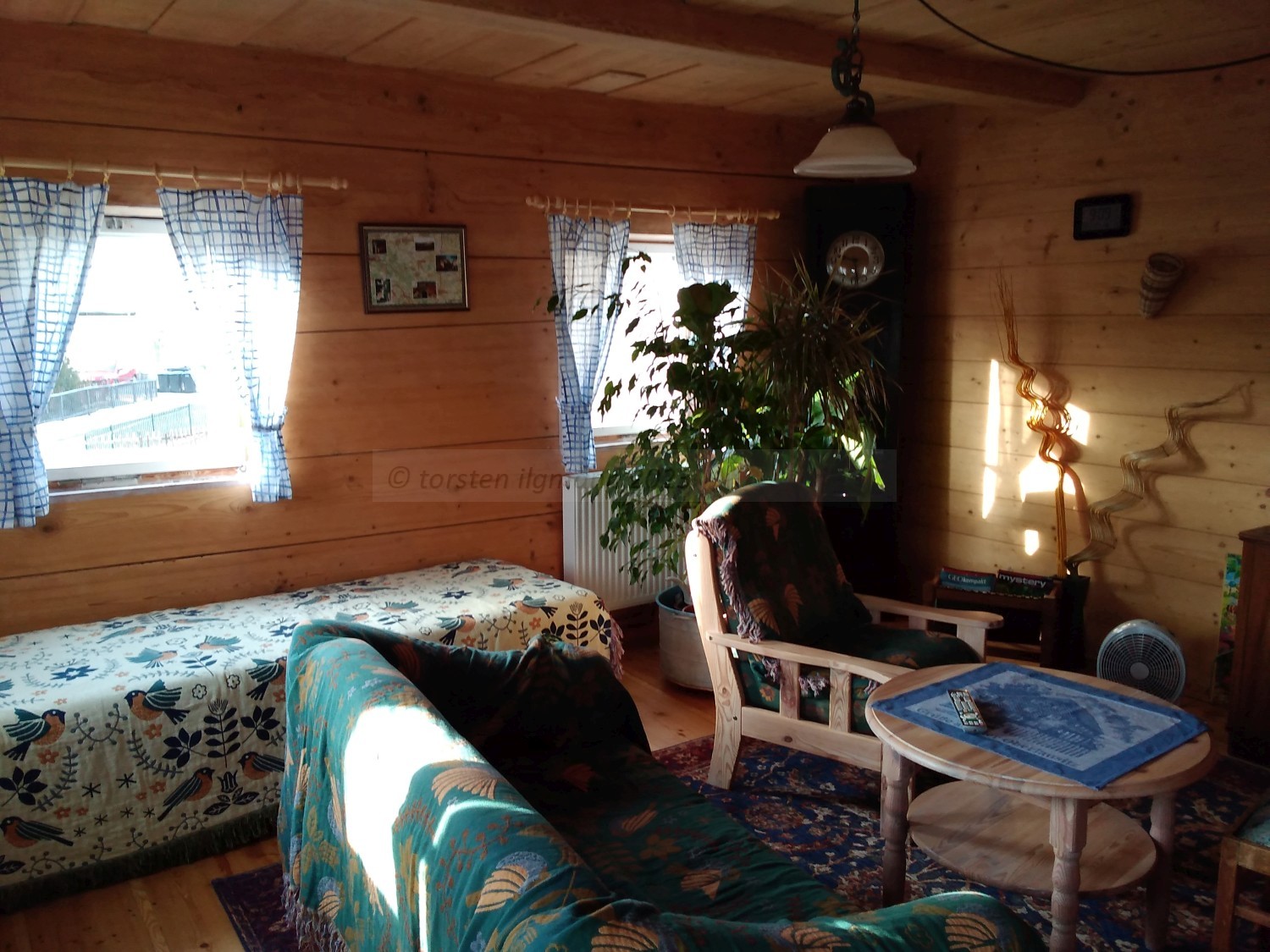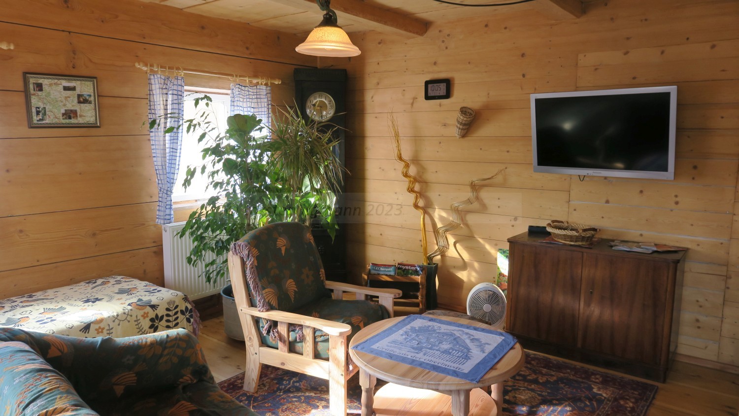 Im anderen Bereich ist ein Sitzbereich, Sessel ,Tisch, TV(Sat), Radio vorhanden. In dem Bereich besteht auch die Möglichkeit zwei weitere Personen mit unterzubringen. (Aufbettung) Als Schlafmöglichkeit sind Stapelbetten (180x80cm) vorhanden