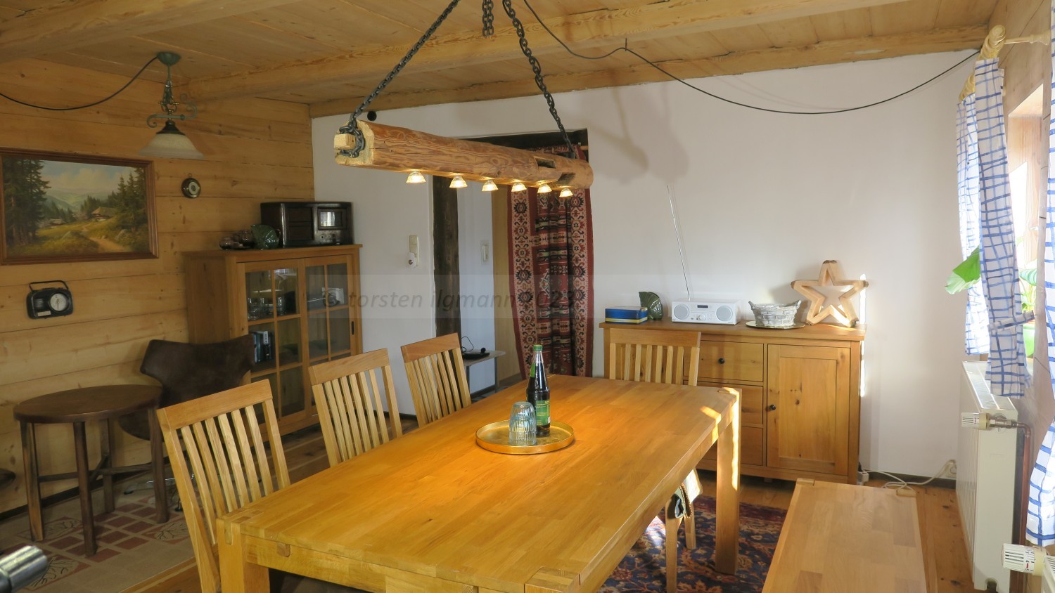 Eine Wohn-Essbereich mit grossen Tisch für bis zu 8 Personen.(* falls Sie Familienurlaub geplant haben, und in Wohnung „Luise“ zum Beispiel die Elter oder Geschwister/Freunde übernachten zu lassen.)