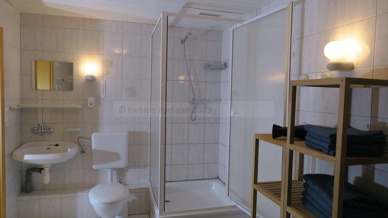 Im Bereich Bad sind Badewanne, Dusche, WC vorhanden